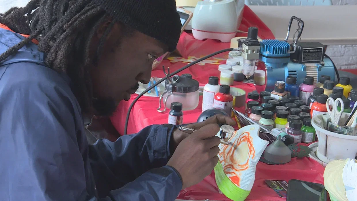 On the second floor of a South End bookstore, two artists sat down at a table Tuesday and assessed their blank canvas: A pair of cleats for Patriots tight end Austin Hooper.